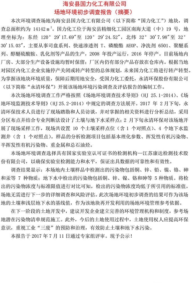 海安縣國力化工有限公司場(chǎng)地環境初步調查報(bào)告(摘要)